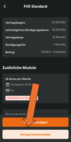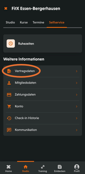 Öffne die FitX-App und klicke im Menüpunkt „Studio“ auf „Self-Service“ und dann auf „Vertragsdaten“. Tippe deinen Vertrag an und lade ihn ganz unkompliziert über den Button „Vertrag herunterladen“ herunter.
